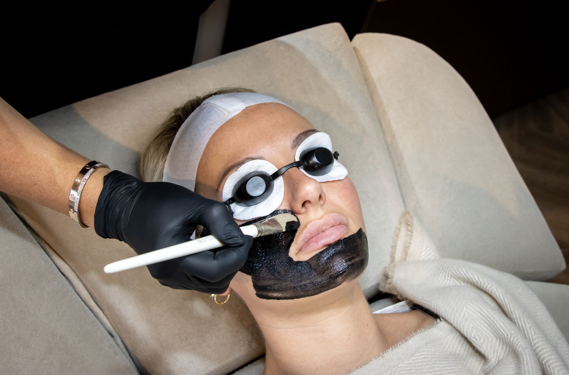 2.Aanbrengen carbon lotion – een dun laagje actieve koolstof wordt op de huid aangebracht. Dit bindt zich aan talg en vuil diep in de poriën